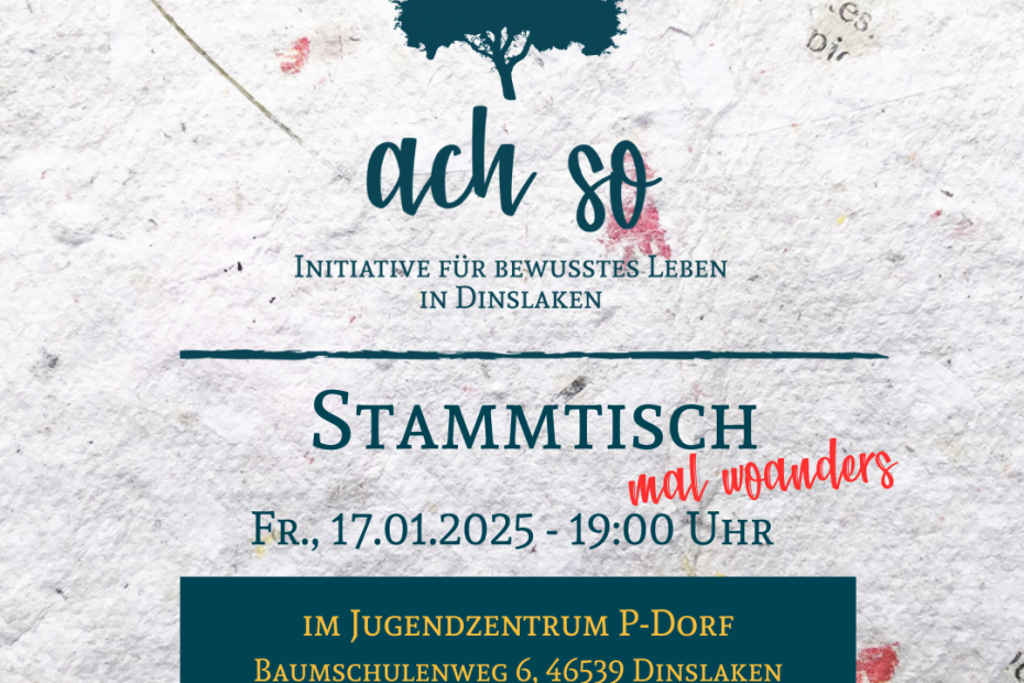 Der dritte Stopp unserer Stammtisch-mal-woanders Reihe. Wie sonst auch wollen wir in entspannter Atmosphäre und bei dem einen oder anderen Kaltgetränk uns und unsere Ideen vorstellen, einander kennen lernen, Anregungen und Erfahrungen teilen und und und… Dieses Mal sind wir im Jugendzentrum P-Dorf in Dinslaken-Hiesfeld eingeladen. Wir freuen uns, euch endlich alle zu sehen (oder überhaupt erstmal kennen zu lernen), mit Euch ins Gespräch zu kommen, ach so!-Momente zu teilen,… Weiterlesen »ACH SO Stammtisch im Jugendzentrum P-Dorf