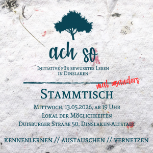 Wir sind eine Gruppe von Menschen, die sich zum Ziel gesetzt hat, neue und bestehende Angebote zum Thema bewusstes Leben in Dinslaken und Umgebung zu bündeln, zu bewerben und auszuweiten. Dinslaken hat eine große Anzahl an Initiativen und Vereinen mit vielen engagierten Akteur*innen, die sich bereits lange für nachhaltige Themen einsetzen und eine größere Reichweite verdienen. Und da kommt ihr ins Spiel: Wir laden euch zu unseren kommenden Stammtischen ein!